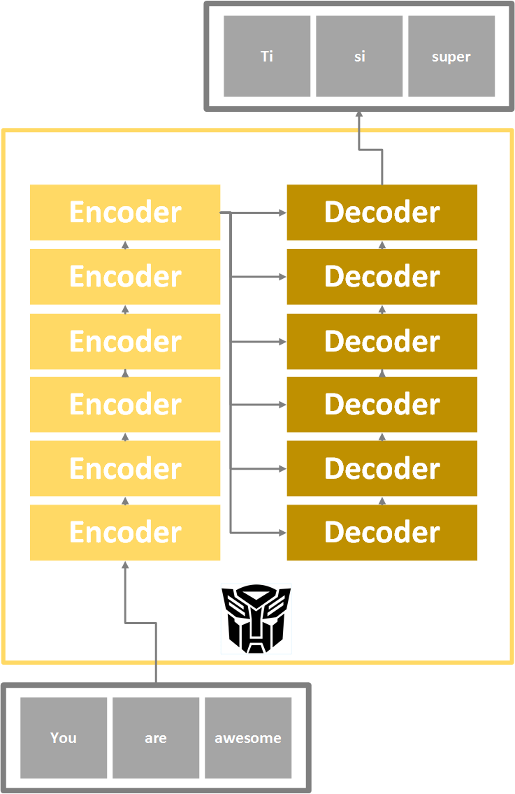 Transformers essentially uses all the aforementioned concepts and fits them together. They give fantastic results in the machine translation tasks. How do they do it? From the high level perspective they don’t look much different from the standard sequence-to-sequence model we explored so far. Except from the cool logo, of course 🙂