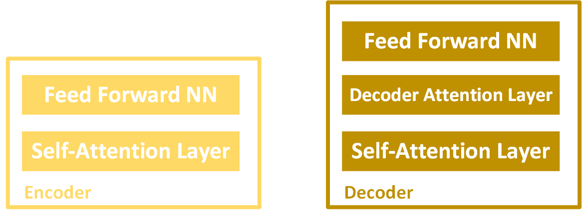 Each encoder is composed of two parts: Self-Attention Layer and Feed Forward Neural Network, while each decoder have three parts: Self-Attention Layer, Decoder Attention Layer and Feed Forward Neural Network. That looks something like this: